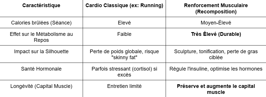 Si le cardio (course, vélo, natation) est excellent pour le cœur et brûle des calories pendant la séance, il a peu d’impact sur votre métabolisme au repos. Pire, un excès de cardio sans apport calorique suffisant peut entraîner une perte de masse musculaire, ralentissant ainsi votre TMB sur le long terme.